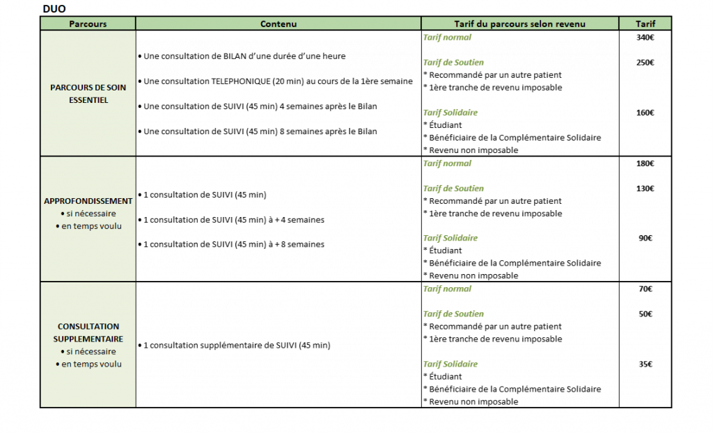Prise en charge pour deux personnes ayant un lien familial qui souhaiteraient arrêter de fumer ensemble et basée sur l’entraide, l’émulation, sous forme de 3 consultations réparties sur 8 semaines et soutenues par des entretiens téléphoniques. A l’issue de cette étape, des consultations supplémentaires pourront être proposées à la demande de l’un ou l’autre des bénéficiaires.