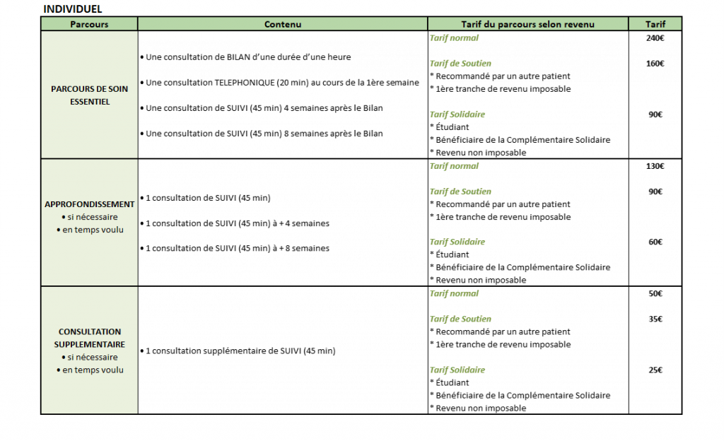 Accompagnement individuel d’aide à l’arrêt du tabac sous forme d’une première session forfaitaire de 3 consultations réparties sur 8 semaines et soutenues par des entretiens téléphoniques. A l’issue de cette étape, des consultations supplémentaires pourront être proposées si nécessaire.